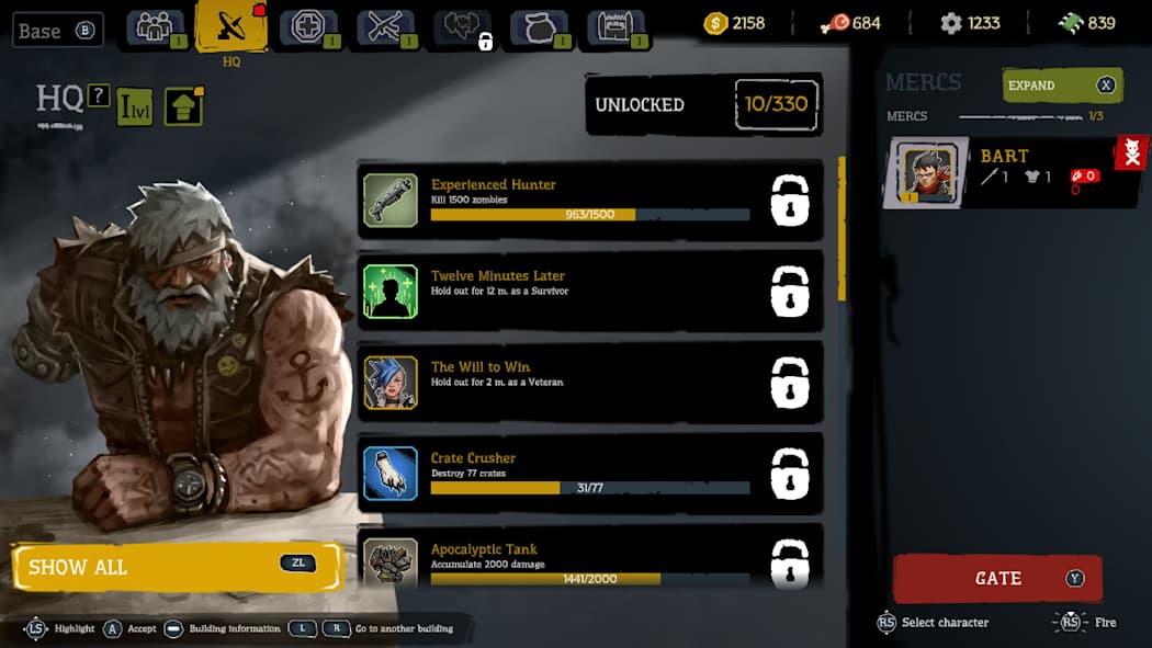 发展幸存者营地,解锁增益。在技能强化大厅升级佣兵技能,前往佣兵营招募新佣兵,在工坊强化武器和护甲。升级建筑可以提高佣兵生存几率。