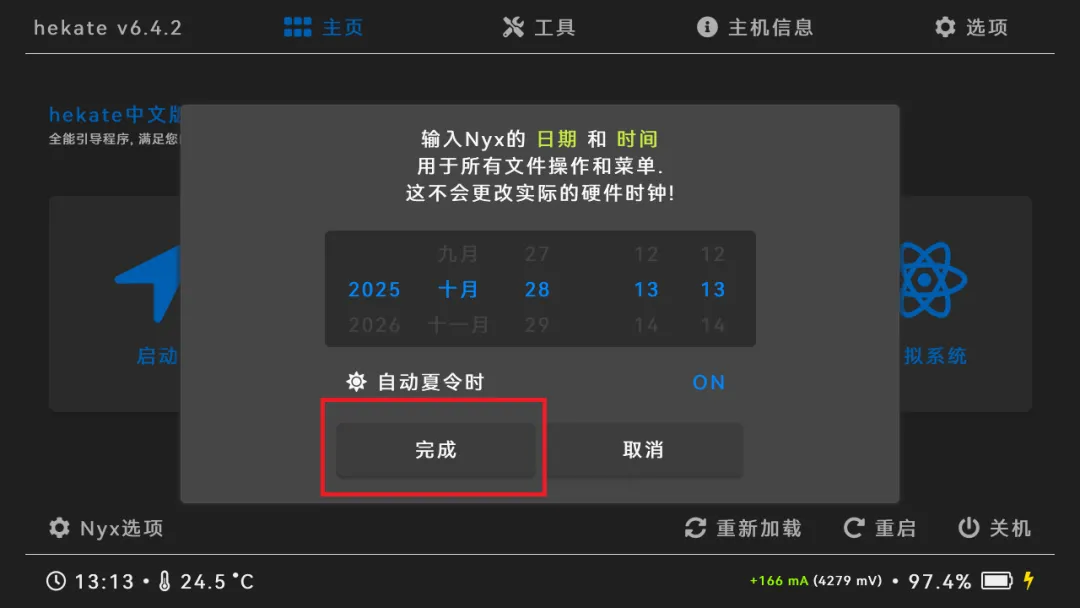1.开机后弹出时间调整界面触屏点击【完成】