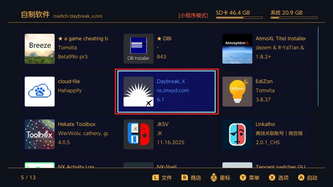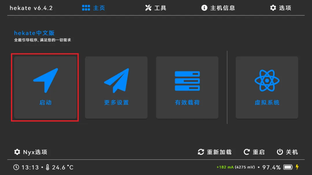系统包复制好后将SD卡插回switch,并引导开机。进入到hekate界面主程序