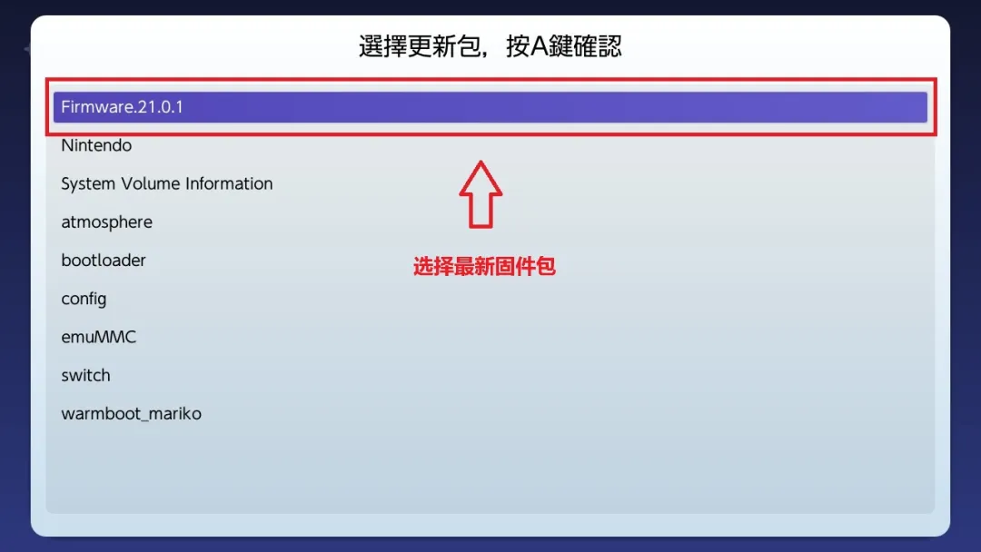 7.选中最新固件选项【Firmware21.0.1】,按 A 确定