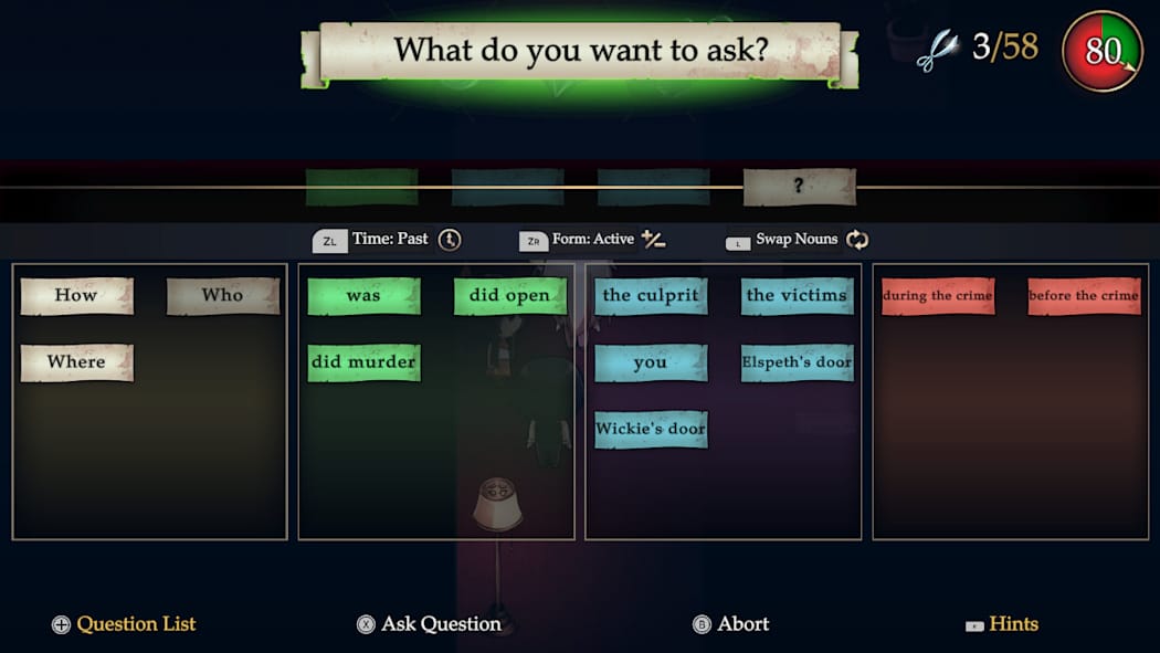 – 通过「纸片词条」搜集线索,组合专属语句审讯嫌疑人。