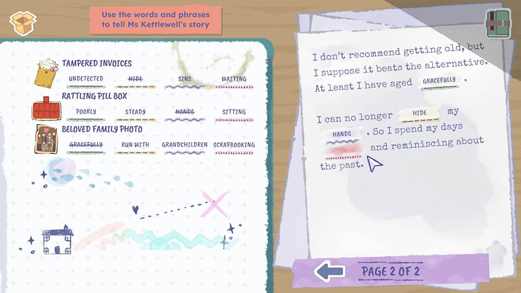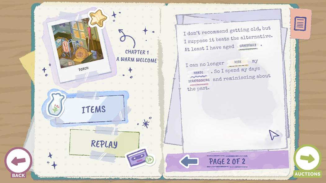 您所保存的每一件物品都会解锁一组相关的词汇。利用这些词汇来填补破损回忆录中的空白,完成句子以揭示一段传奇的人生。