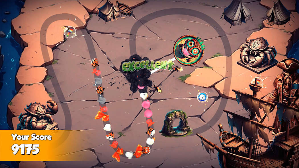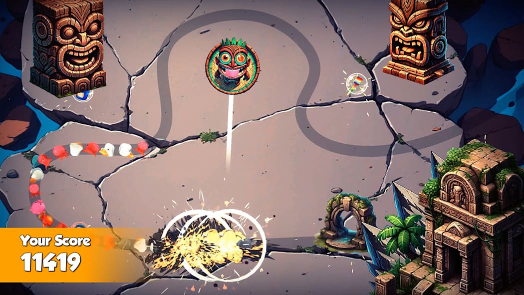 在各个关卡之间,你可以利用各种强大的岛屿力量:爆炸性宝石可以摧毁成群的宝石;时间冻结功能可以让滚动的宝石停止移动;重新着色功能可以将下一颗宝石变成任意颜色;慢动作功能可以减缓宝石的移动速度;破坏性射击则能消除那些异常突出的宝石;而时间回溯功能则允许你撤销上次的投掷,从而获得第二次机会。